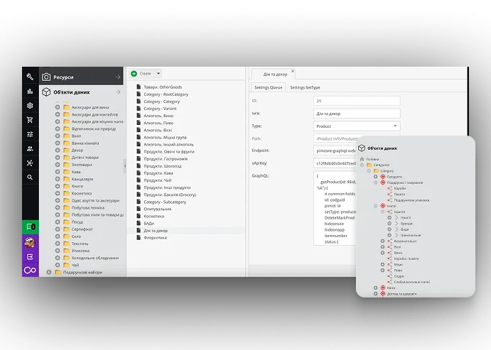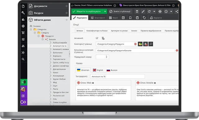 The process of working on the concept began with two interview sessions. This is important in order to fully gather the client’s requirements and expectations. Several simple cases were prepared to test the capabilities of the systems. Together with the customer’s team, after preliminary analysis of the PIM system market in Ukraine, we chose the most optimal PIMCore. After detailing the product card and the main catalog tree, we integrated the system into the company’s current IT landscape and configured integrations with RabbitMQ and S3.