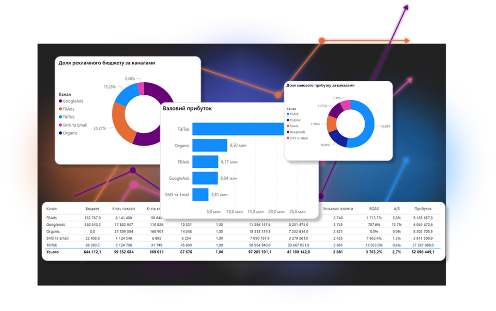 ROAS аналітика показує не просто повернення на витрати, а чистий прибуток по кожному каналу — Facebook, Google, TikTok ads, органіка.