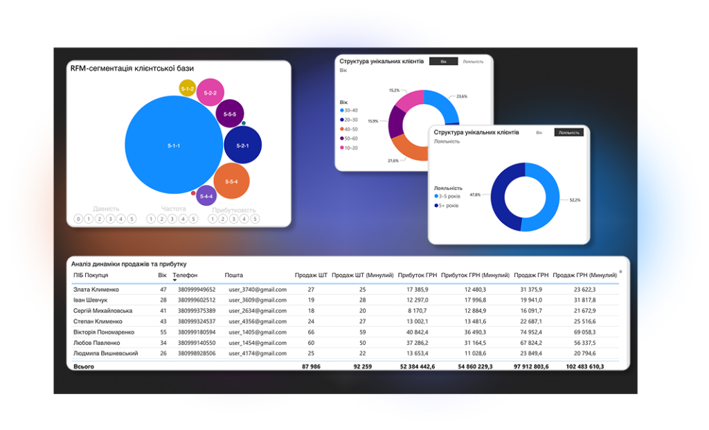 Автоматично розділяє базу клієнтів за частотою, давністю і сумою покупок. Ви одразу бачите, хто приносить 80% прибутку, кого потрібно повертати і кого варто утримати персональною пропозицією.